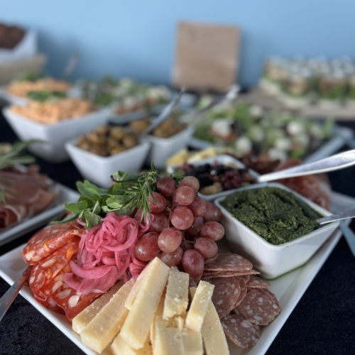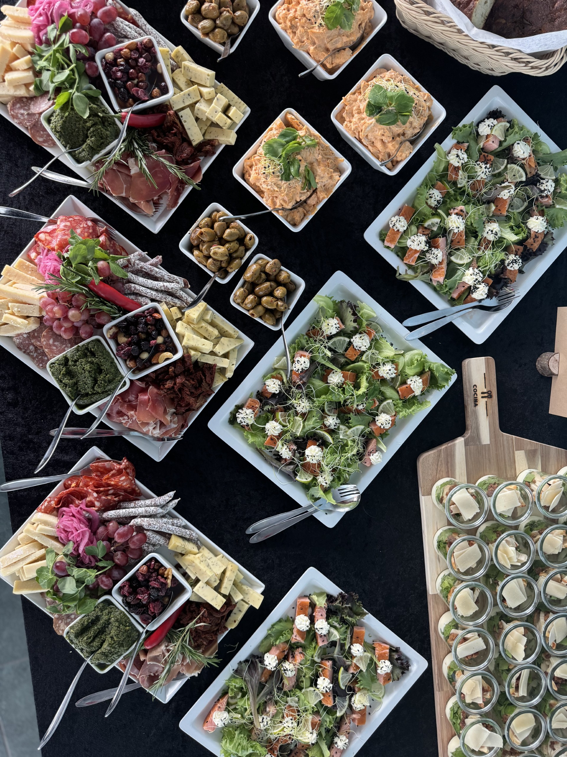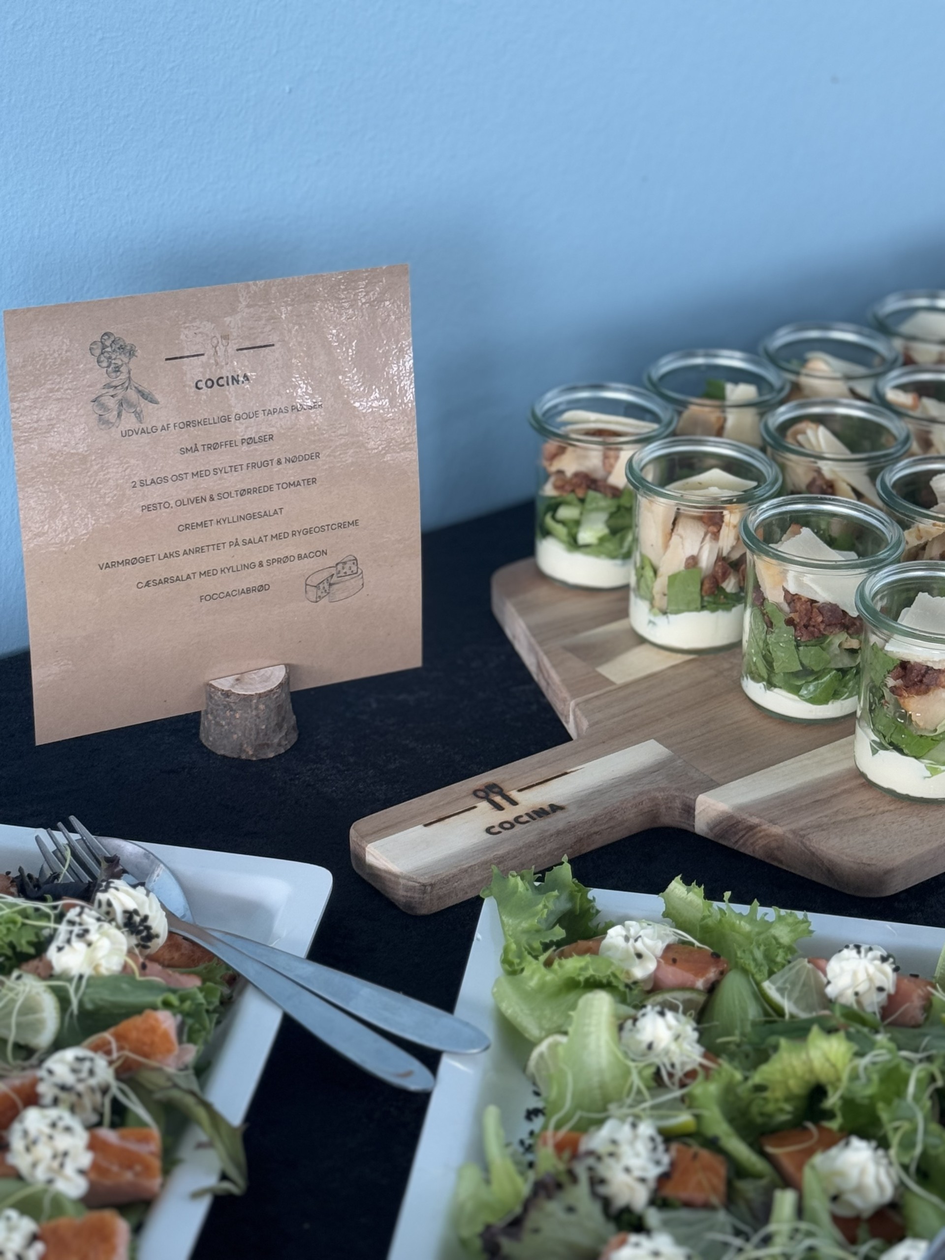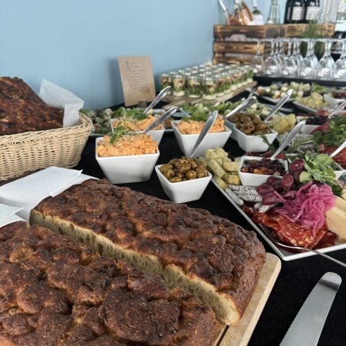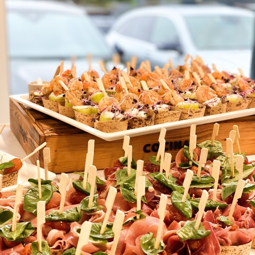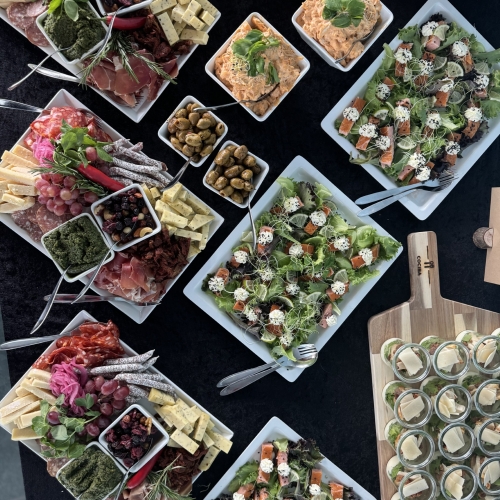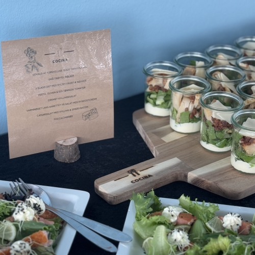 Vi sørger for maden – uanset om det skal være en stående reception med små tapas og bobler eller en lun buffet, hvor alle kan gå til.