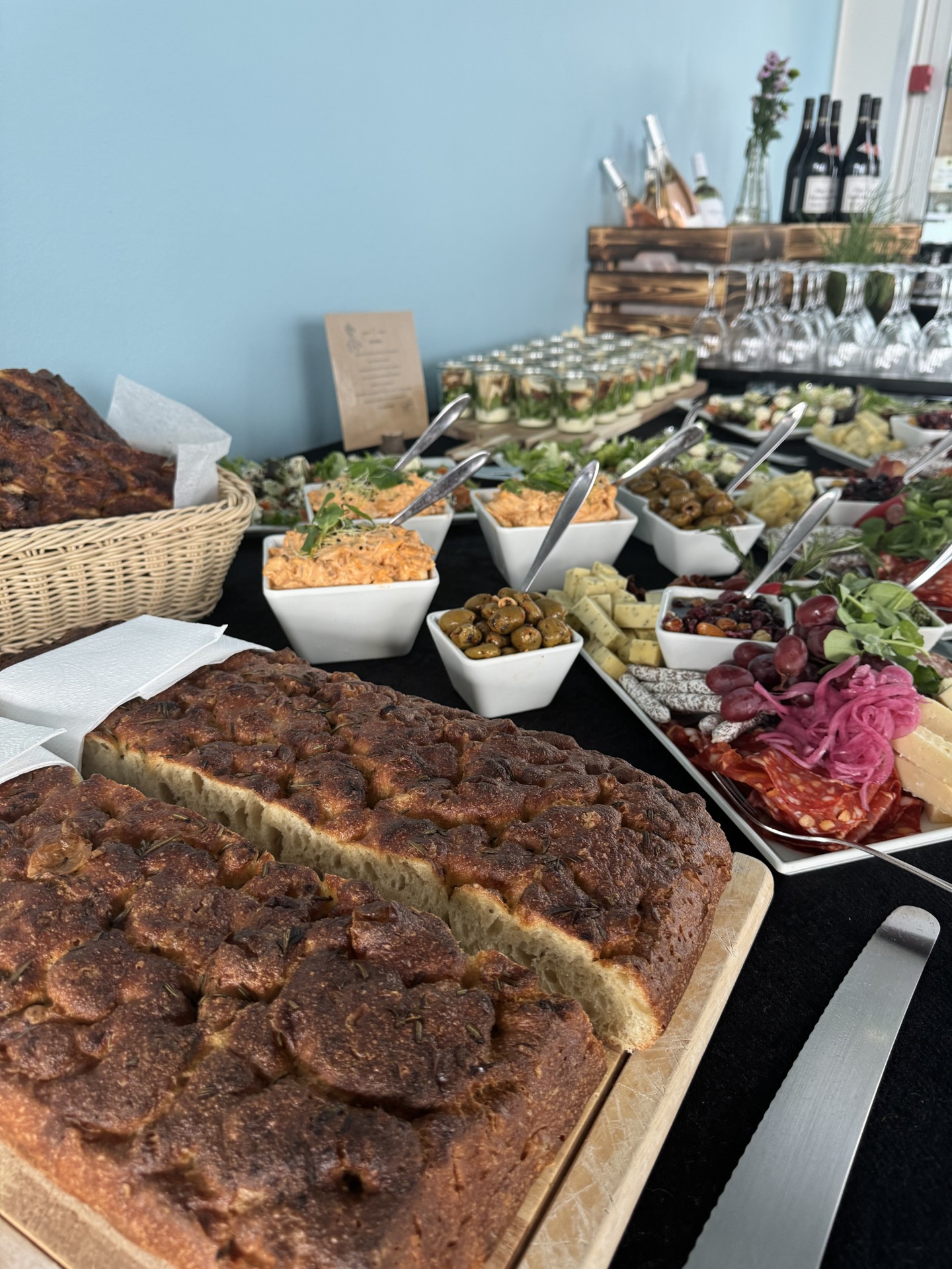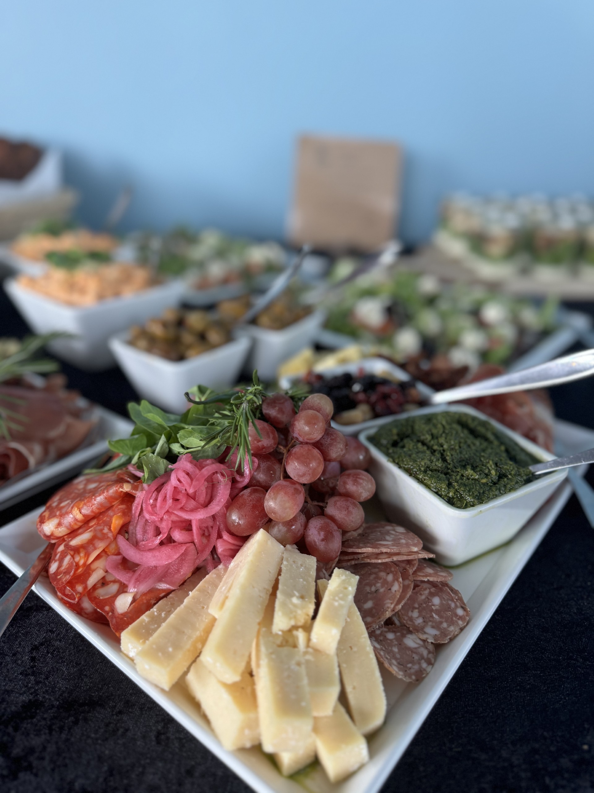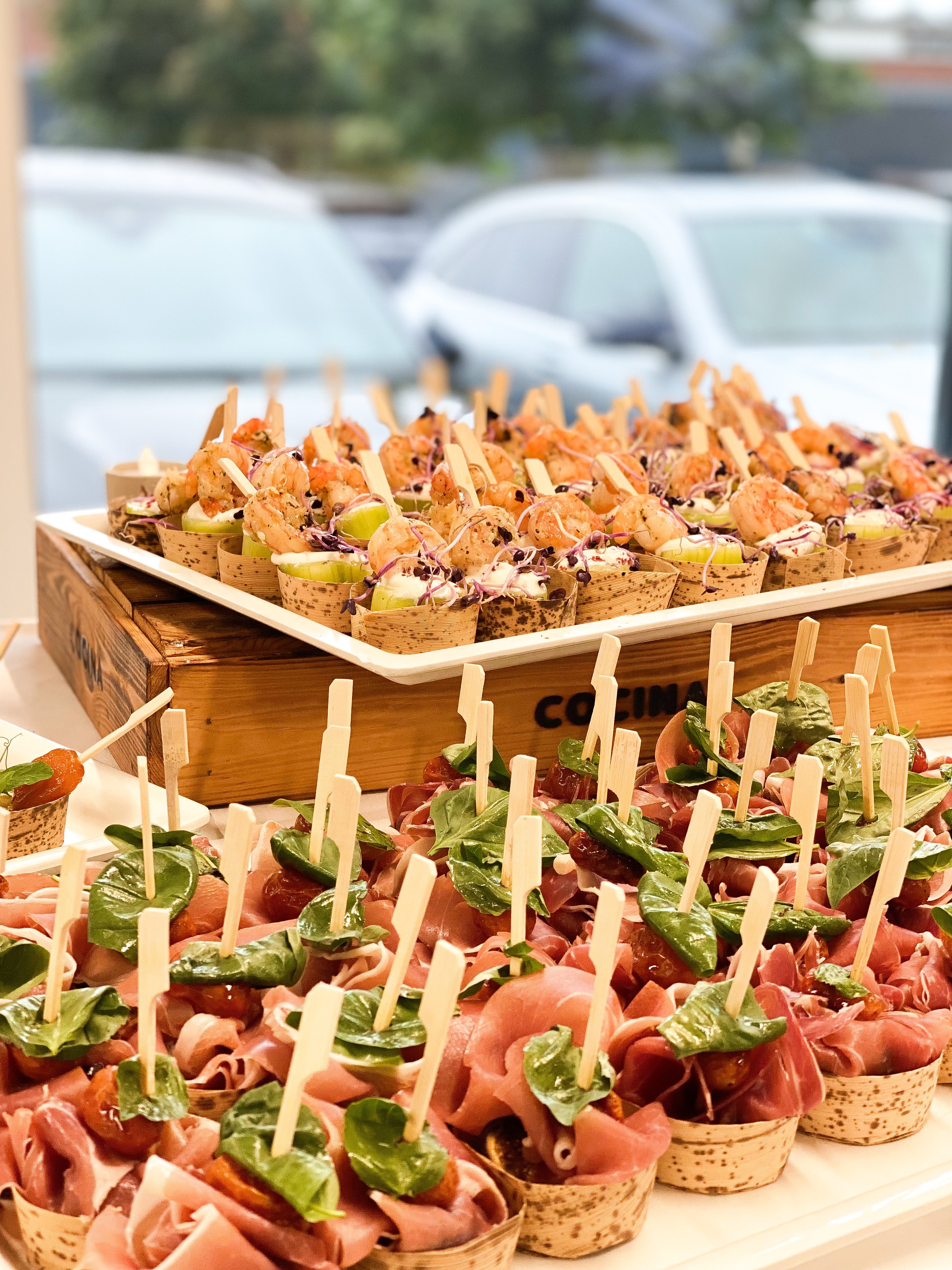 Vi sørger for maden – uanset om det skal være en stående reception med små tapas og bobler eller en lun buffet, hvor alle kan gå til.
